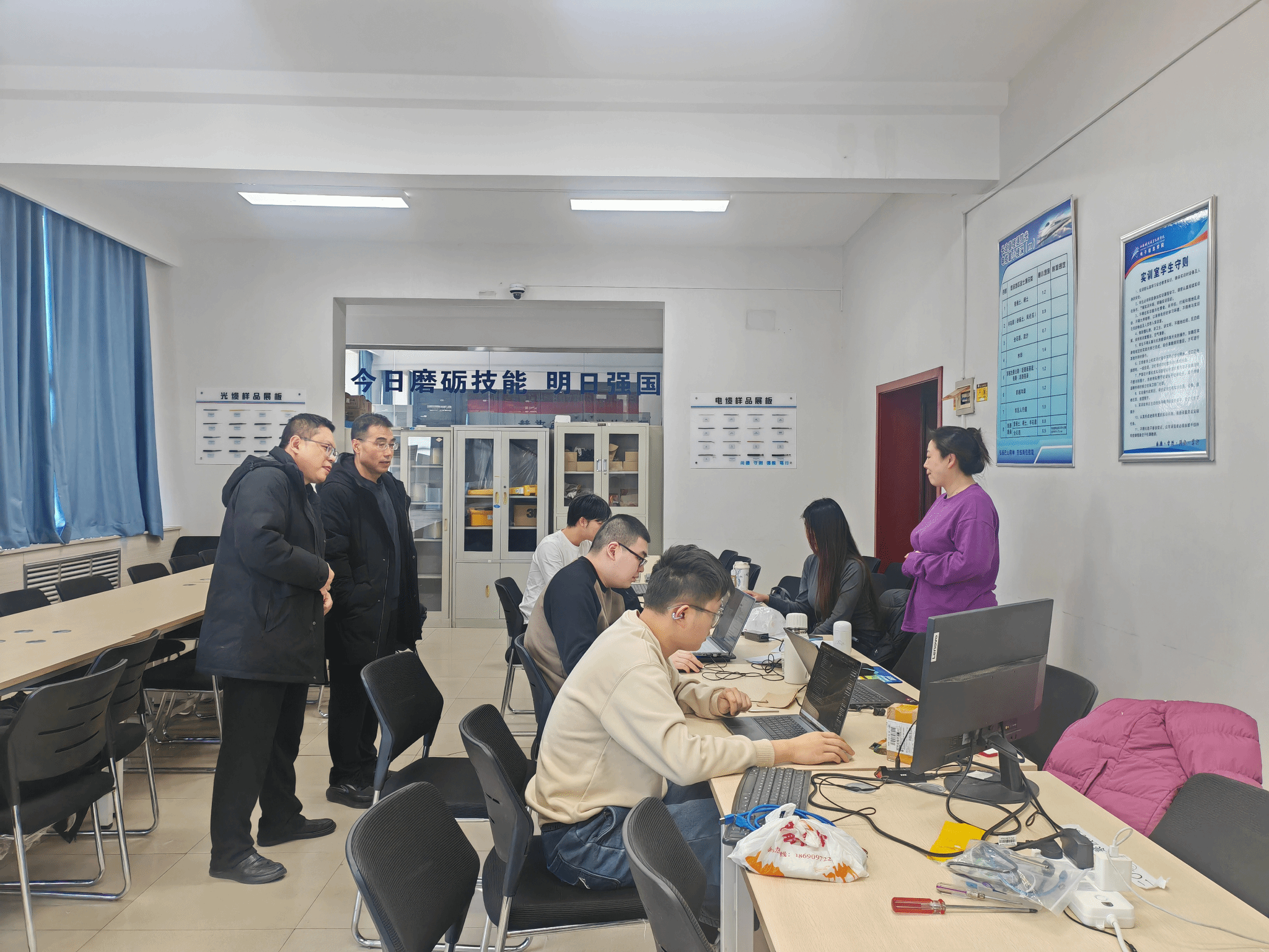 在慰问过程中,滕勇先后深入两个学院的各个备赛现场,与备赛师生们面对面亲切交流,详细询问了各参赛队伍的备赛进度、训练难点、后勤保障等相关情况。他指出,技能大赛是检验教学成果、锤炼学生综合能力的重要平台,更是同学们增长才干、开阔视野、提升竞争力的宝贵契机,对个人专业成长和长远发展意义深远。他对指导教师们在备赛期间的悉心指导、辛勤付出表示衷心感谢,对参赛同学们全身心投入、刻苦钻研的备赛态度给予了高度赞扬。同时,他勉励各备赛团队要发扬顽强拼搏、团结协作的精神,坚定信心、勇毅前行,力争取得优异成绩。